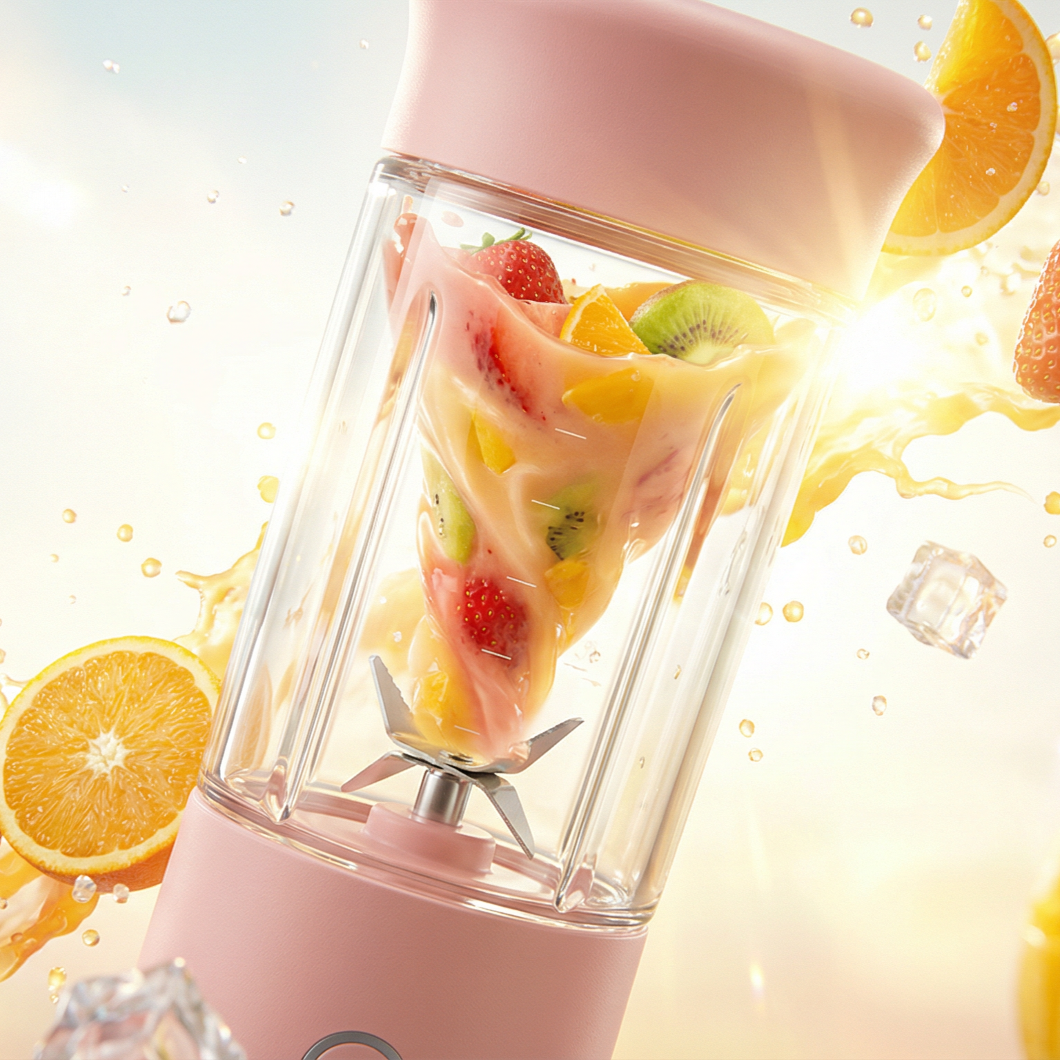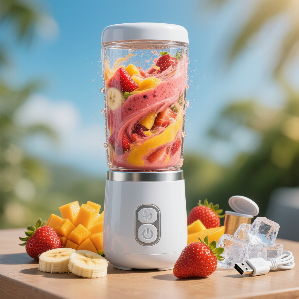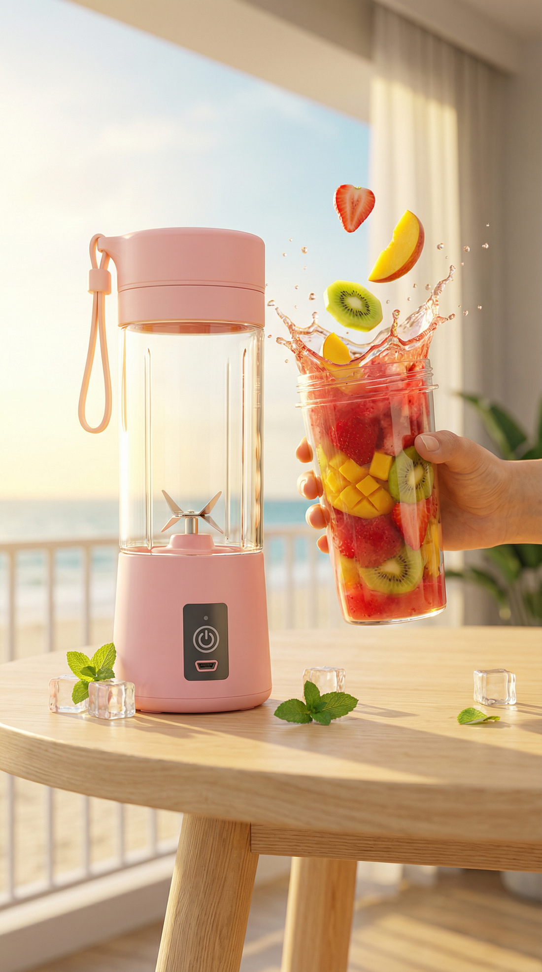 The Portable Fruit Blender is equipped with a high-speed motor and sharp stainless-steel blades, capable of blending fresh fruits, soft vegetables, protein powders, and even small ice cubes with ease.